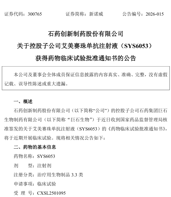 3月4日,石药创新制药股份有限公司(股票名称:新诺威,股票代码:300765.SZ)发布公告,其控股子公司石药集团巨石生物制药有限公司(以下简称“巨石生物”)于近日收到国家药品监督管理局核准签发的关于艾美赛珠单抗注射液(SYS6053)的《药物临床试验批准通知书》,将于近期开展临床试验。